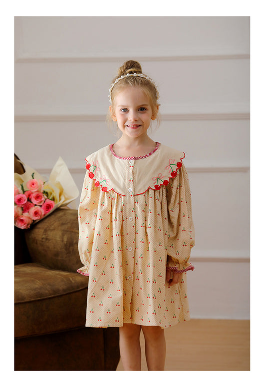 Arrival Autumn Girls Cherry Pattern Single Breasted Long Sleeves Dress with Embroidery Collar