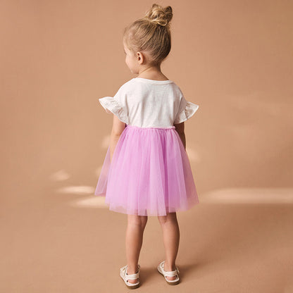 Summer Pure Cotton Cartoon Dancers Pattern Short Sleeves Tulle Patchwork Dress for Stylish Girls