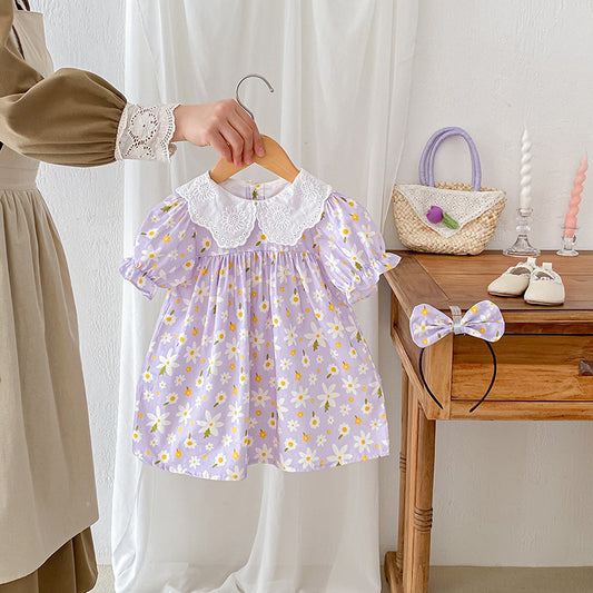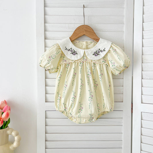 Summer Girls Flowers Pattern Short Sleeves Embroidery Collar Onesies And Dress – Sister Matching Clothing Set