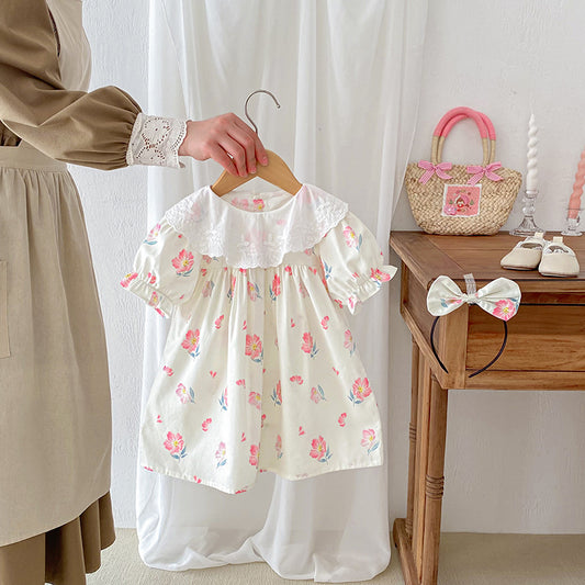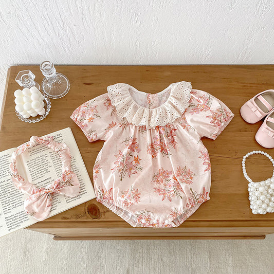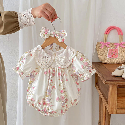 Summer Girls Flowers Pattern Short Sleeves Hollow Out Collar Onesies And Clothing Set – Sister Matching Clothing Set