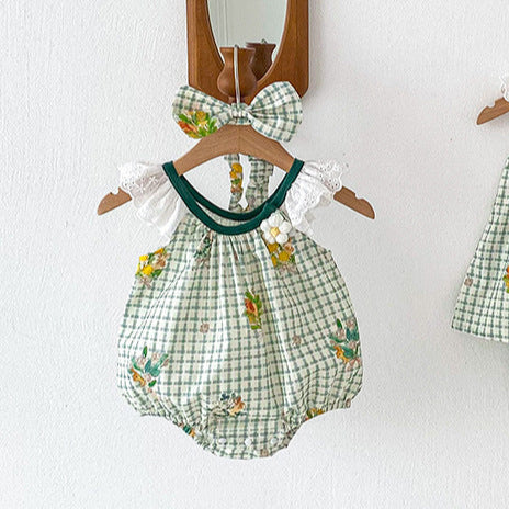 Summer Girls Plaid And Flowers Pattern Sleeveless Hollow Out Lace Strap Onesies