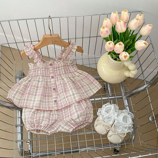 Summer Baby Kids Girls Plaid Sleeveless Strap Single Breasted Top And Shorts Casual Clothing Set