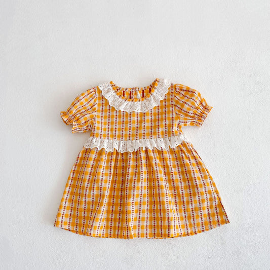 Summer Girls Plaid Design Flowers Pattern Short Sleeves Hollow Out Collar Onesies And Clothing Set – Sister Matching Clothing Set