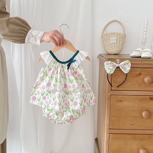 Summer Girls Flowers Pattern Sleeveless Lace Strap Onesies And Clothing Set – Sister Matching Clothing Set