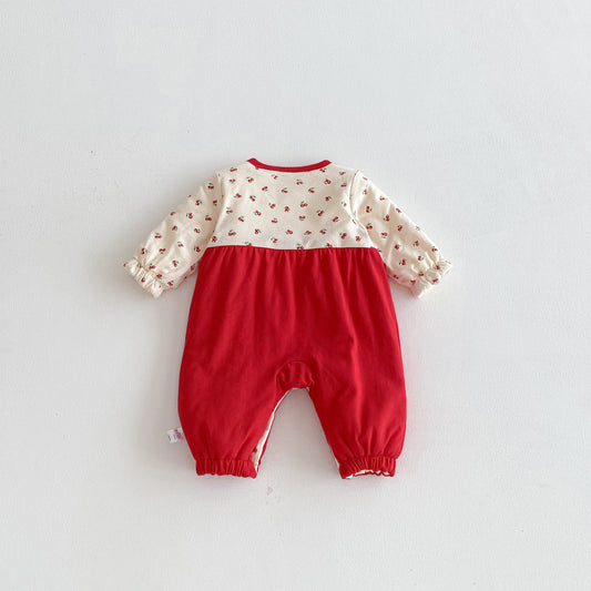 Autumn and Winter Arrival Baby Girls Long Sleeves Cherry Pattern Color Patchwork Rompers