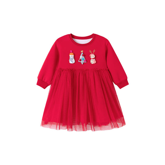 Autumn and Winter Warm Arrival Christmas Cartoon Pattern Long Sleeves Crew Neck Dress for Stylish Girls