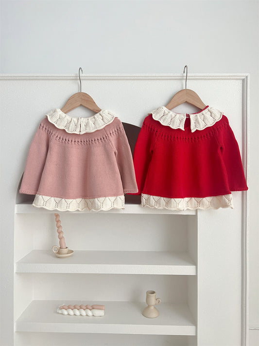 Autumn Arrival Baby Kids Girls Comfortable Hollow-out Design Knitted Long Sleeves Top with Flowers Embroidery Pattern and Collar