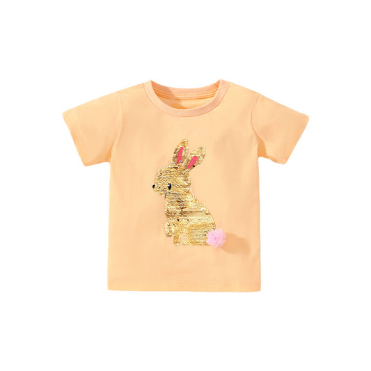 Cute Knit Round Neck Shimmer Girls’ T-Shirt In European And American Style For Summer