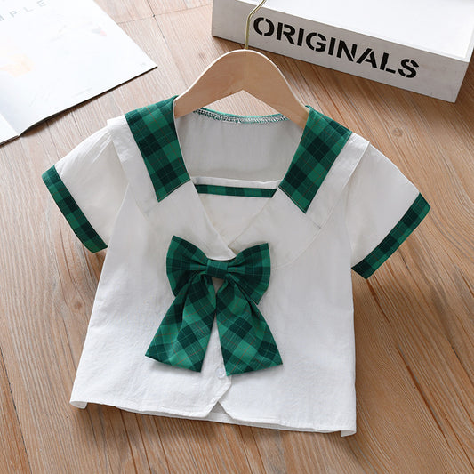 Summer Design Baby Kids Girls Geometric Argyle Pattern Square Neck Short Sleeves Preppy Tops