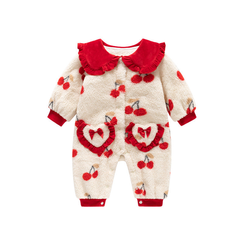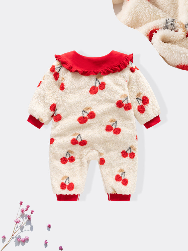 Autumn and Winter Arrival Baby Girls Cherry Pattern Polar Fleece Rompers