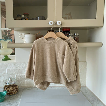 Spring Baby And Kids Unisex Solid Color Pullover Top With Pocket And Pants Clothing Set
