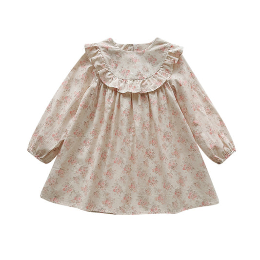 Autumn Arrival Baby Kids Girls Floral Pattern Long Sleeves Dress with Double-Layer Collar