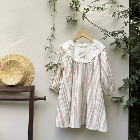 Autumn Arrival Baby Kids Girls Cherry Embroidery Pattern Long Sleeves Striped Dress