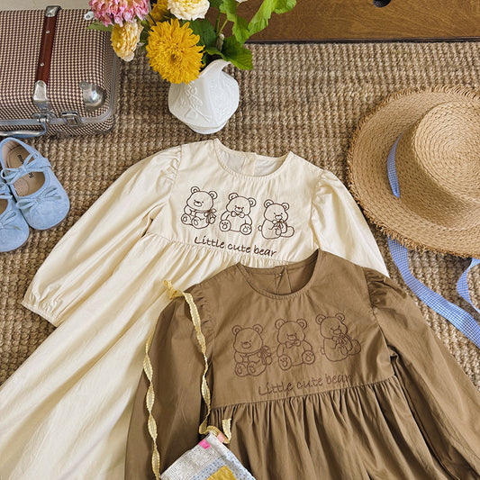 Baby Kids Girls Teddy Bear and Letters Pattern Long Sleeves Crew Neck Dress