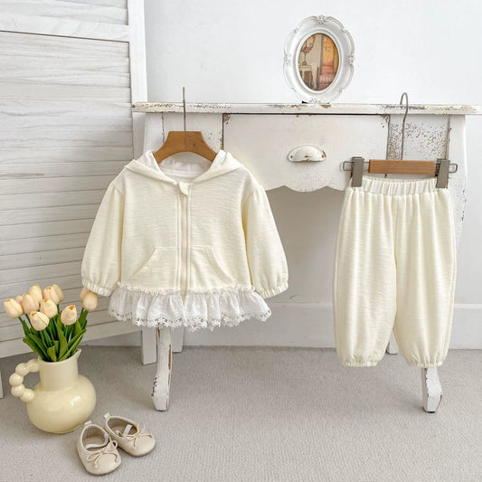Spring and Autumn Kids Girls Floral Lace Decorated Long Sleeves Coat and Solid Color Pants 2-piece Clothing Set