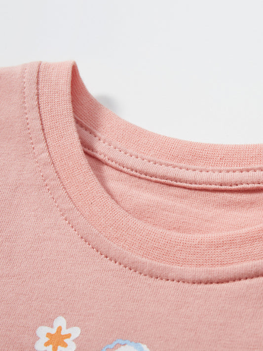 Pink Baby Girl Allover Floral Graphic Puff Sleeve Square Neck Cotton T-Shirt