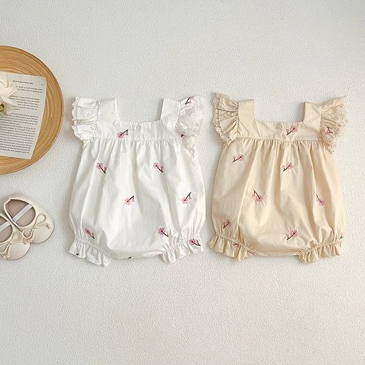 Baby Girls Floral Print Ruffle Design Square-Collar Summer Cotton Onesies