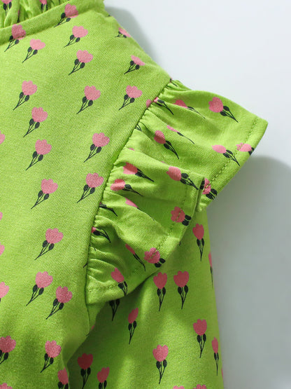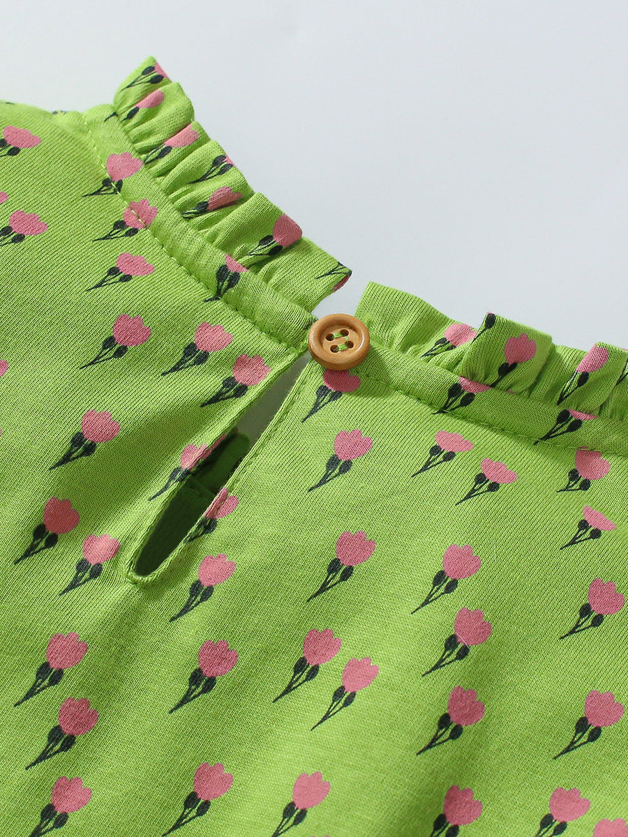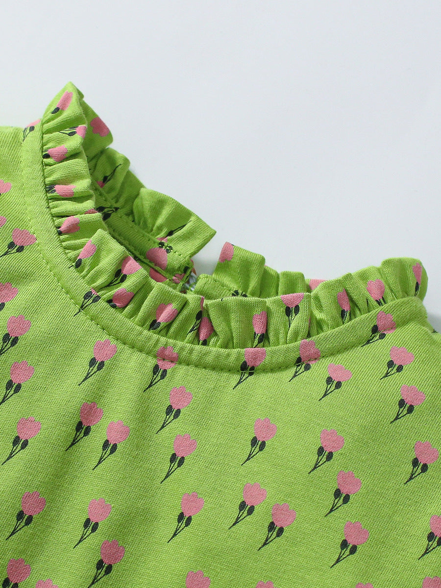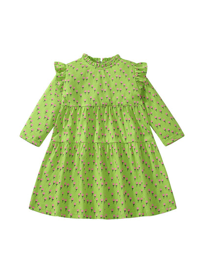 Design Autumn Girls Little Flowers Pattern Ruffle Neck Long Sleeves Green Dress