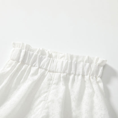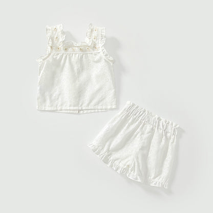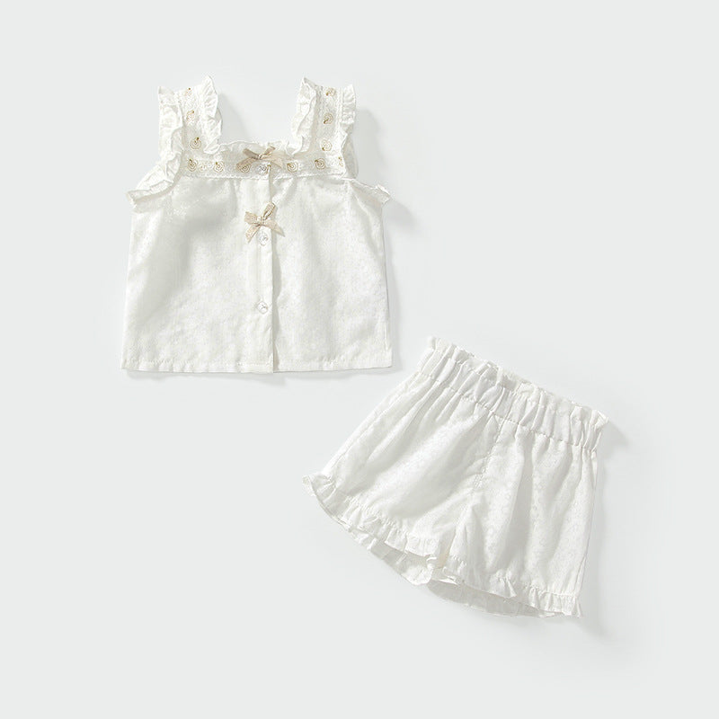 This elegant summer set features a sleeveless top vest and matching shorts adorned with a delicate floral pattern, designed specifically for young girls. Crafted to provide comfort and breathability, it ensures ease of movement during warm days while maintaining a refined, stylish appearance. Perfect for casual outings or special occasions, this ensemble combines practicality with a graceful aesthetic.