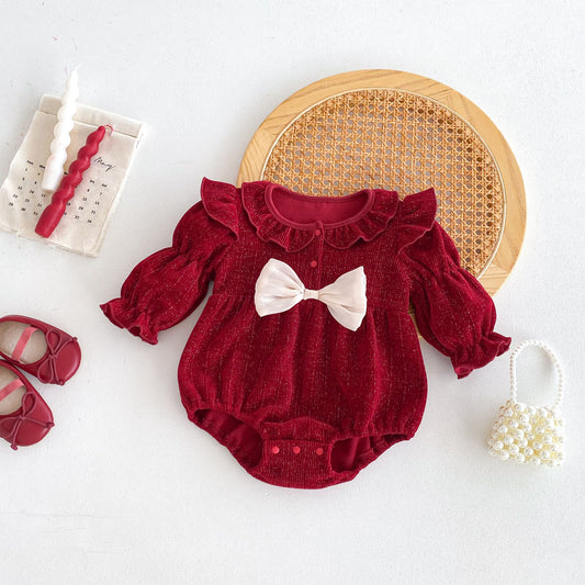 Autumn Arrival Baby Girls Long Sleeves Single Breasted Red Romper Bodysuits