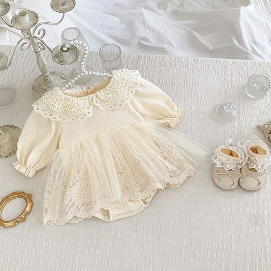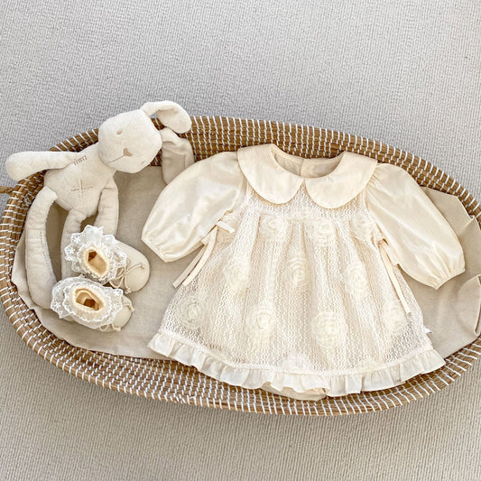 Autumn Arrival Baby Girls Long Sleeves Beige Embroidery Onesies Dress