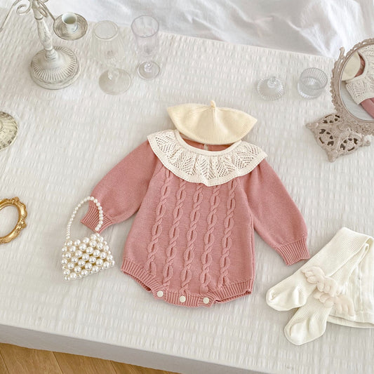 Autumn Arrival Baby Girls Knitted Long Sleeves Jacquard Pattern Ruffle Collar Onesies