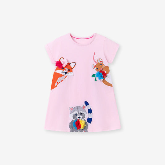 Autumn Arrival Kids Girls Teddy Bear and Striped Pattern Long Sleeves Crew Neck Dress with Tulle