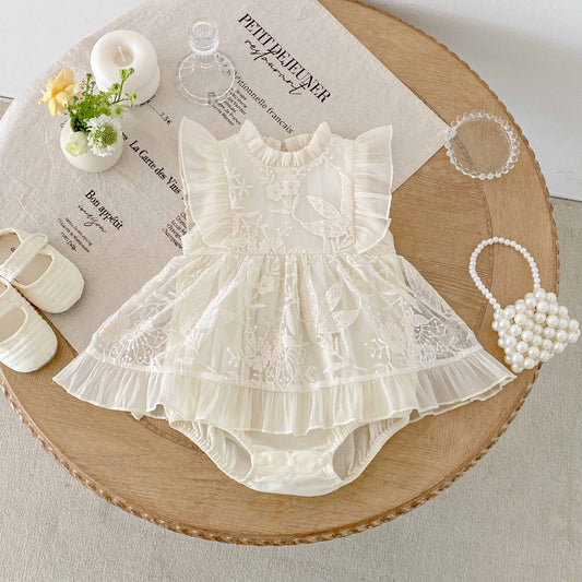Summer Arrival Baby Girls Cute Solid Color Floral Embroidery Fly Sleeves Dress Design Onesies