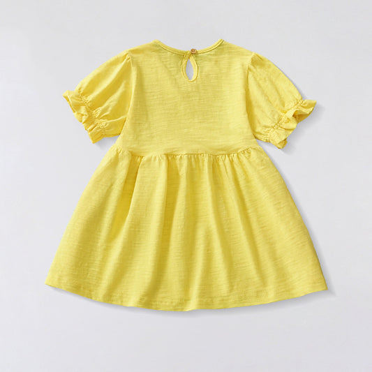 Summer Pure Cotton Colorful Rainbow and Dinosaur Pattern Short Sleeves Yellow Dress for Stylish Girls