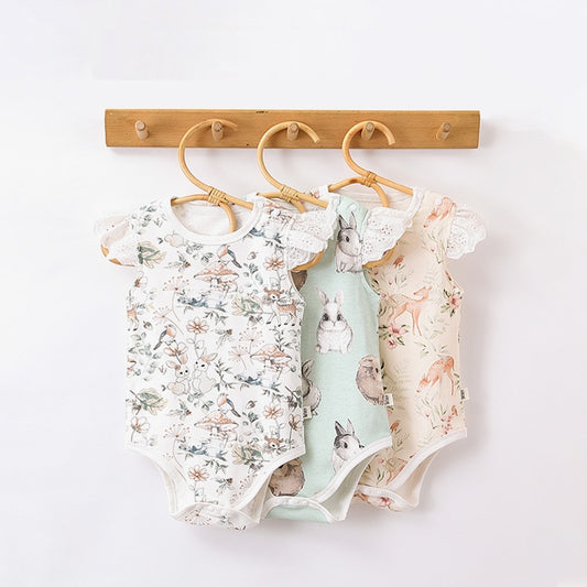 Summer Baby Girls Cartoon Print Fly Sleeves Crew Neck Thin Onesies