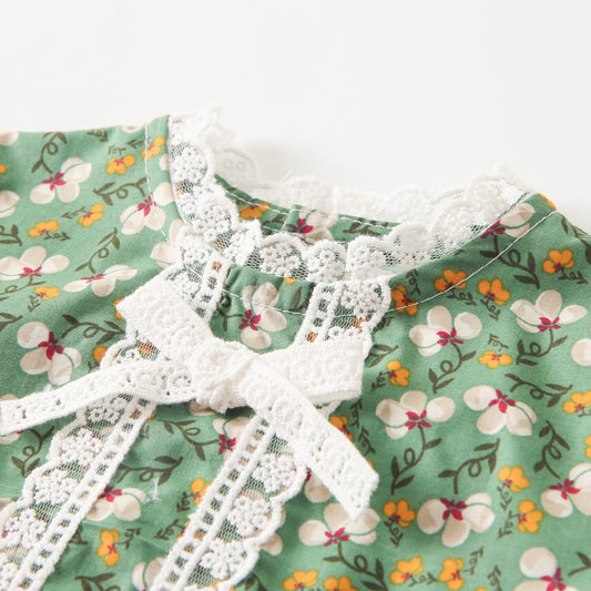 Summer Arrival Baby Girls Floral Print Short Sleeves Lace Neck Vintage Onesies