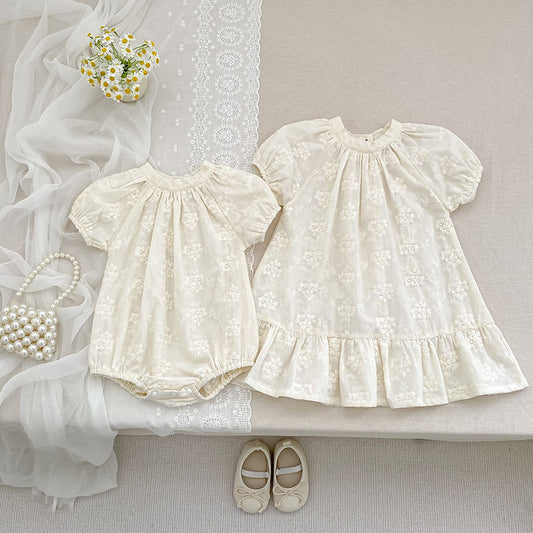 Summer Girls Solid Color Flowers Embroidery Short Sleeves Onesies and Girls’ Dress – Princess Sister Matching Set