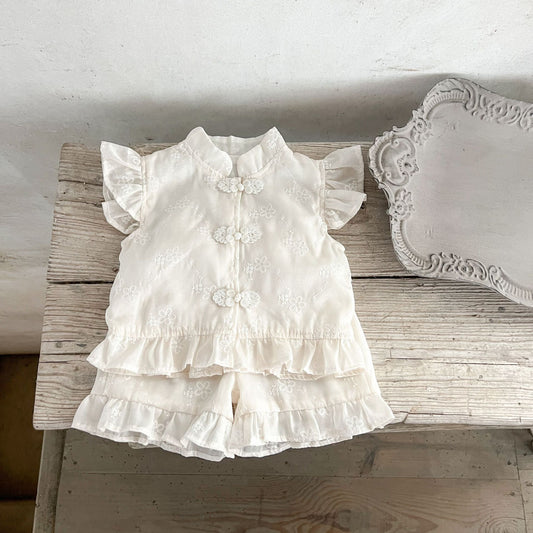 Summer Arrival Baby Girls Fly Sleeves Stand Collar Solid Color Floral Embroidery Top And Bloomers Clothing Set