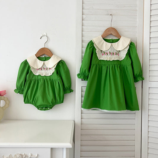 Arrival Autumn Baby Kids Girls Long Sleeves Peter Pan Collar Embroidery Flowers Pattern Onesies and Dress – Princess Sister Matching Set