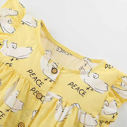 Summer Arrival Cartoon and Letters Pattern Fly Sleeves Dress for Stylish Girls
