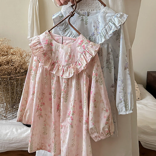 Spring and Autumn Flowers Print Crew Neck Long-sleeved Dress for Stylish Girls