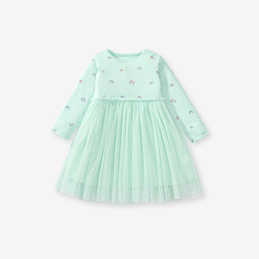 Arrival Autumn Girls Rainbows Print Crew Neck Long Sleeves Tulle Patchwork Princess Dress