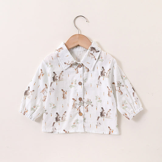 Autumn Baby Unisex Cute Rabbit Print Turn-down Collar Top and Embroidered Overalls
