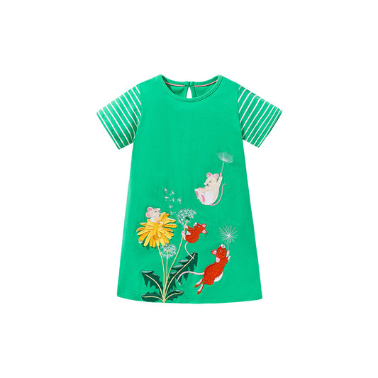 Summer Arrival Animals and Flowers Cartoon Pattern Short Sleeves Dress for Stylish Girls