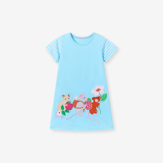 Summer Pure Cotton Animals Cartoon Pattern Short Sleeves Dress for Stylish Girls