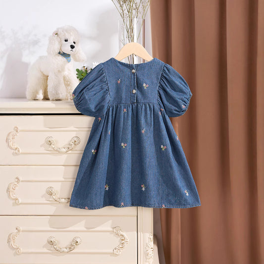 Summer Baby Kids Girls Denim Short Sleeves Flowers Pattern Embroidered Dress