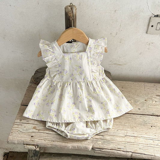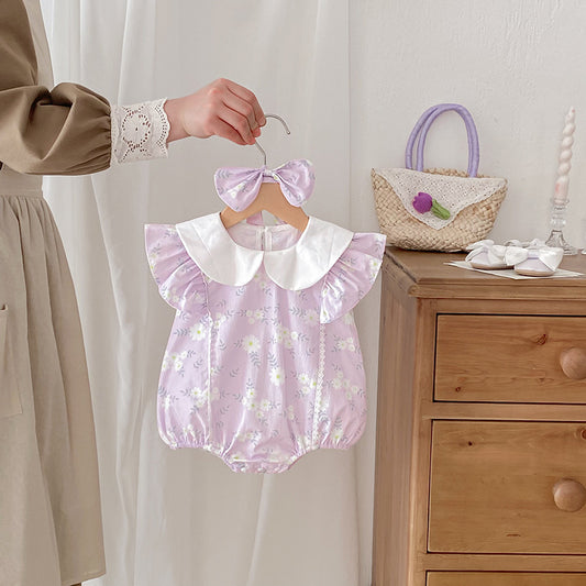 Design Summer Girls Flowers Pattern Fly Sleeves Peter Pan Collar Onesies And Dress – Sister Matching Clothing Set