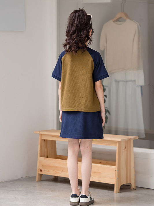 Summer Hot Selling Girls Color Patchwork Short Sleeves T-Shirt And Solid Color Skirt Clothing Set