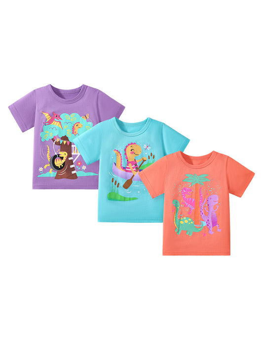 Pieces Girls’ Dinosaurs Cartoon Pattern Short Sleeves T-shirt in European and American Style for Summer