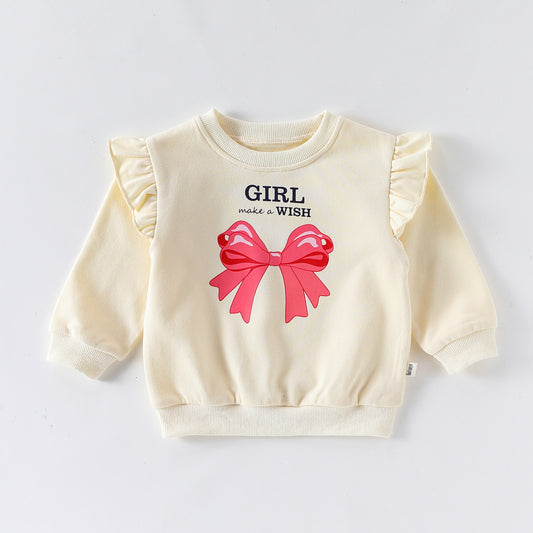 Conjunto de ropa para niña de primavera y otoño con top de manga larga decorado con lazos de mariposa y pantalones lisos