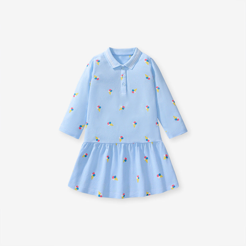 Vestido estilo polo de manga larga con cuello vuelto y estampado de dibujos animados para niñas de otoño