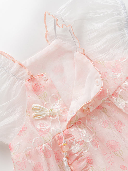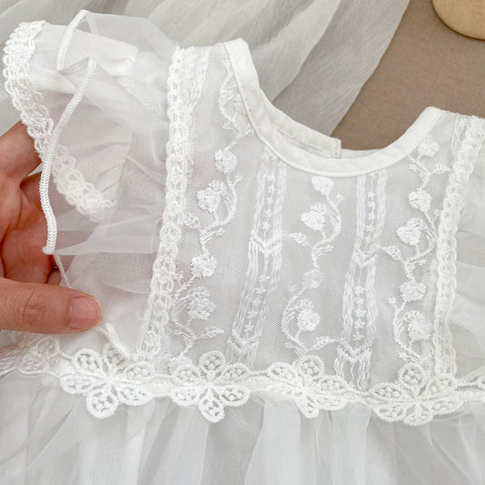 Vestido de princesa de malla fina con flores y cuello con volantes y mangas cortas para niñas pequeñas de verano muy vendido