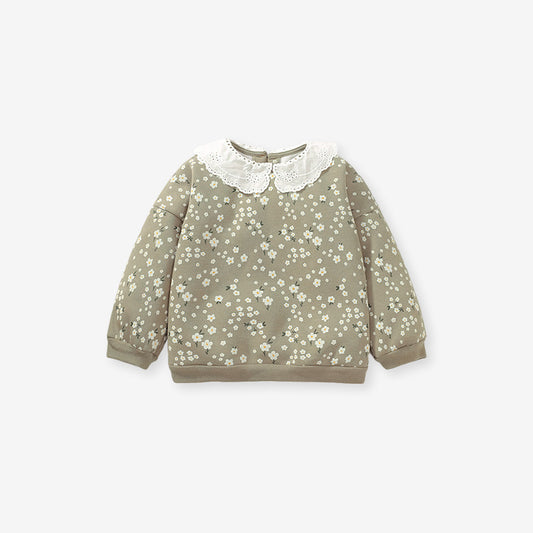 Suéter de manga larga con cuello Peter Pan y ribete de encaje para niñas pequeñas