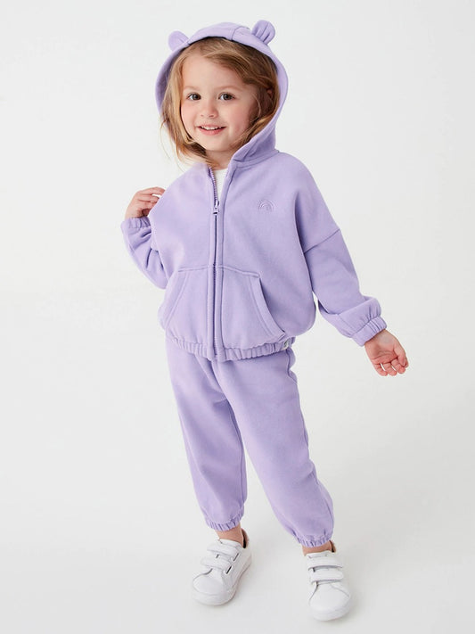 Conjunto de 2 piezas con capucha y pantalón con cremallera y diseño de conejo de color liso y acogedor para niñas