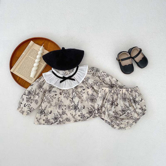 Adorable conjunto de pelele con cuello de encaje y vestido con estampado floral para niñas: conjunto a juego para princesas y hermanas